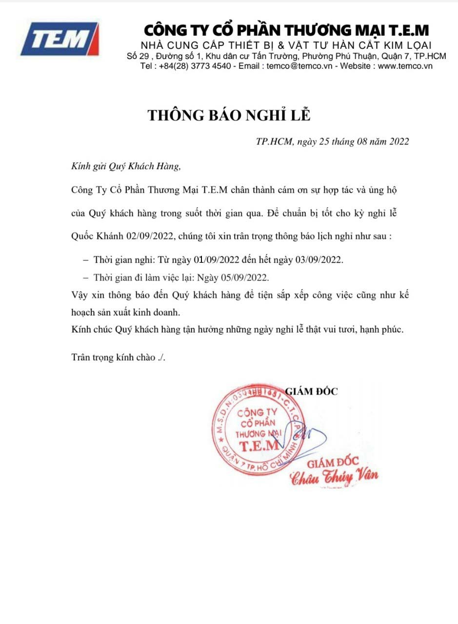 Đễ tiện sắp xếp công việc cũng như sản xuất kinh doanh, Quí khách vui lòng xem thông báo đính kèm bên dưới.